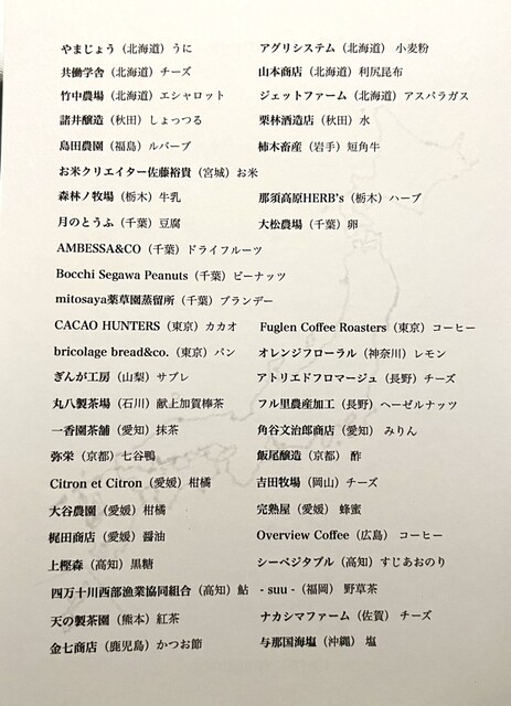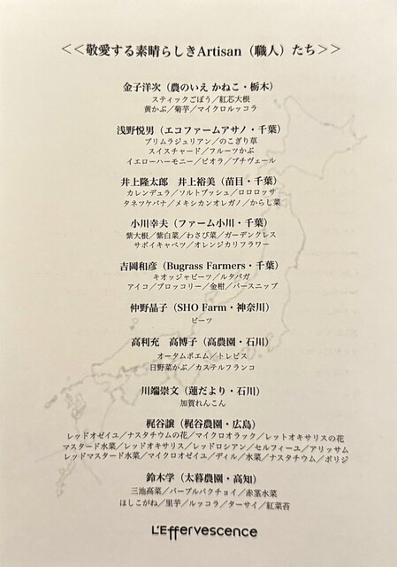 その他の料理に関しても、各食材分野のアルチザン(職人)の方々の地方食材をふんだんに使用し、シェフの匠の技で食材の個性を最大限に活かして見事な一皿に昇華させている。