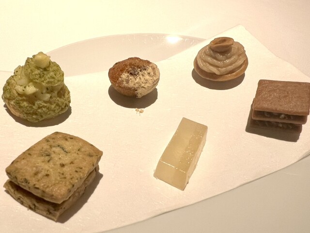 パイナップル 無花果の葉のシュー/落花生のフィナンシェ/ ヘーゼルナッツのプチモンブラン