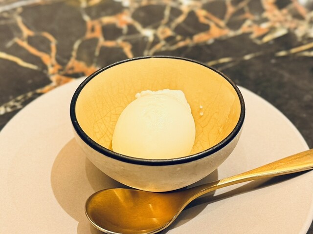 ▷▷▷ アイスは乳酸発酵させており、まるでヨーグルトの様な味わい。そこに葡萄の皮を混ぜ込んでいるので食感も楽しめる。