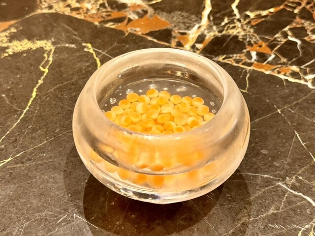 ▷▷▷出汁のきいたジュレの中に、漬けにする前の旨味を全面に押し出した白いイクラと赤いイクラをたっぷりと浮かべた一品。