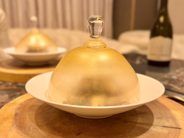 ▷▷▷陶器製のクロッシュをお皿に被せ、それを開けると様々なキノコの香りがフワっと広がる何とも風情ある秋の味覚を楽しめる一品。アクセントの生落花生はこれだけでも美味い。雲丹のソースと合わせて太刀魚を口に運べば幸せいっぱいな味わいとなる。