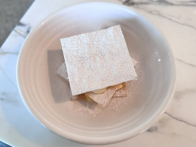 セモリナカスタードクリームに甘いりんごのコンポートをパートフィロ(薄く焼いたパイ生地)でミルフィーユ状に挟んだデザート。