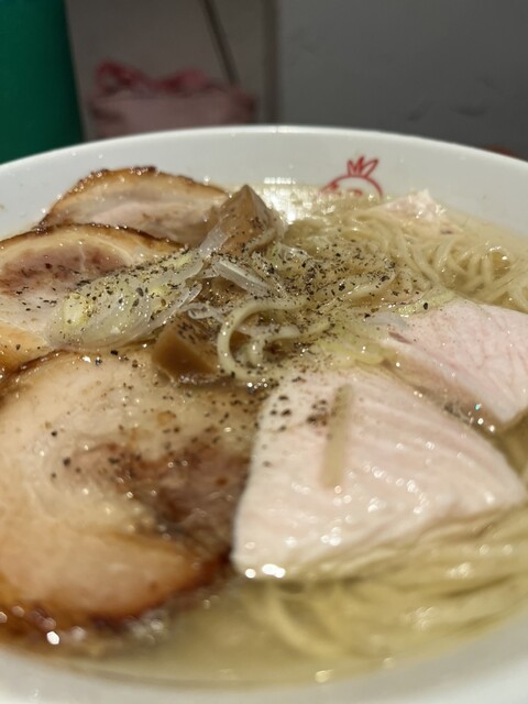 クィーンの曲が流れる中、登場した塩らーめんは、黄身がかった透き通ったスープに二種のチャーシューが計 6枚も鎮座した逸品で、食欲を掻き立ててくれます。