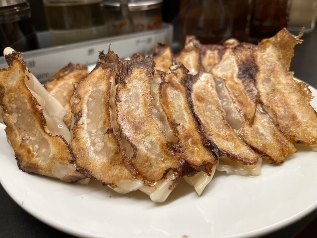 想像以上に、ピリ辛味のため、にんにくスライスのパンチが際立ち、ビールを飲むピッチがめちゃ早くなりました。結果として、ぎょうざが来る前に1杯飲み干してました…