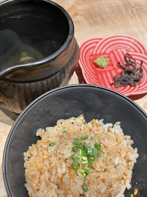 →まずはそのままいただきましたが、濃厚でガツンときます。次にカツオ出汁、塩昆布、ワサビでひつまぶし風でいただきました。こちらはガラリと変わってとても優しい味になります。ライス好きとしては二種類の味わいが楽しめてありがたいです。