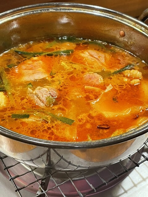 濃厚で旨味たっぷり、ピリ辛でコク深い味になってます。ホルモンの脂と食感がスープに溶け込んで、キャベツ、ニラ、もやしなどの野菜がホルモンの脂を吸って甘みがマシマシで至高の一品です。更にラム肉を追加で注文してしゃぶしゃぶしていただきましたが、こちらもラム肉の甘さとスープの辛味のバランスが最強で凄いの一言です。