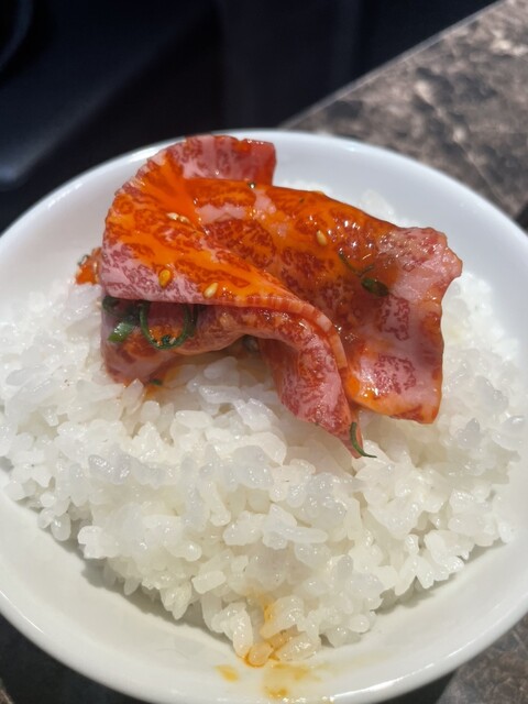 →お肉9割、ご飯1割くらいでインチアップしたタイヤみたいです。生肉は濃厚でしっとりした旨みで口の中でとろけるようなコクがあります。これにごま油と塩が加わって香ばしさとまろやかさが合わさって贅沢極まりない一品です。