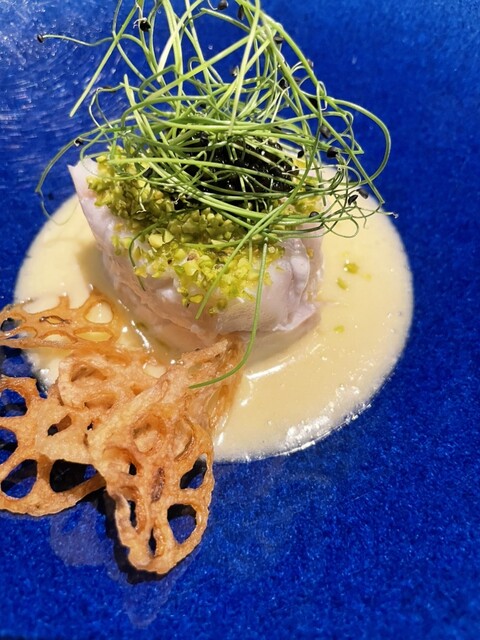 →真鯛のポシェです。キャビアが乗っていて贅沢の極みです。水の甘さと魚の清らかさが溶け合ったような旨味が立ち上がります。白身の純粋な甘さが舌の上でじんわり広がって、食べ終わった時に不思議と甘さが残るような食感です。