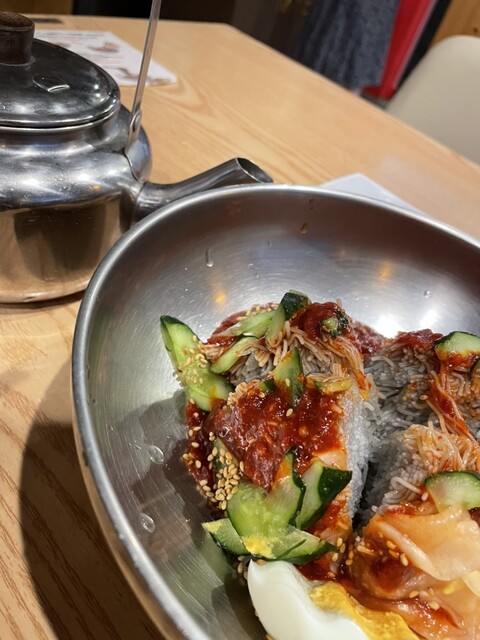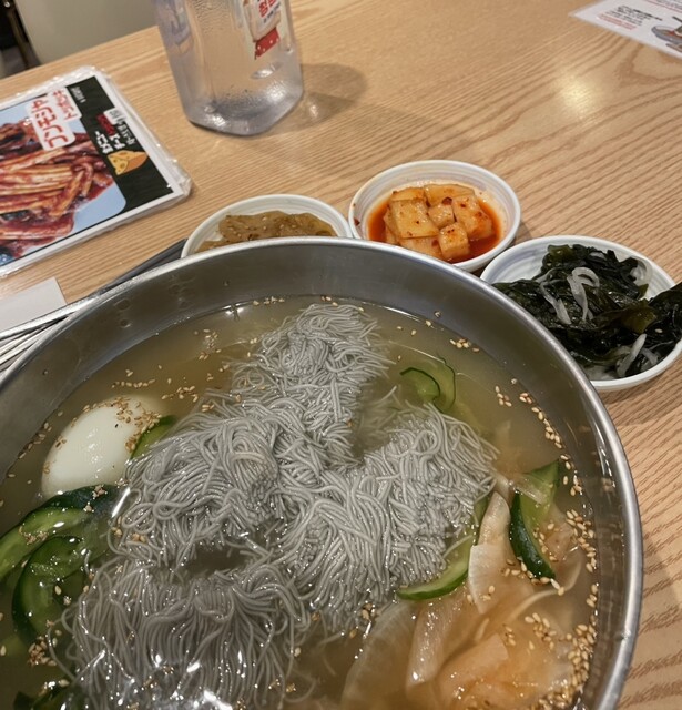 外は寒いけれど、無性に食べたくって来店。水冷麺をいただきました。スープはみぞれタイプになっていましたが、口の中でシュワーと溶けて風味が広がるのが乾燥する冬にもよいかも。小皿のおかずが3品とたっぷり付いているので、色々な食感も楽しめ、しっかり食事になります!体が冷えてきたりはしませんでした!専門店ということで安定したお味で1年中いただけるのが嬉しい!