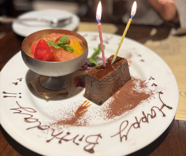 バースデーメッセージを書いてもらったデザートはチョコプリンと、軽く酒に漬けたフルーツ。これもちゃんと美味しかった。