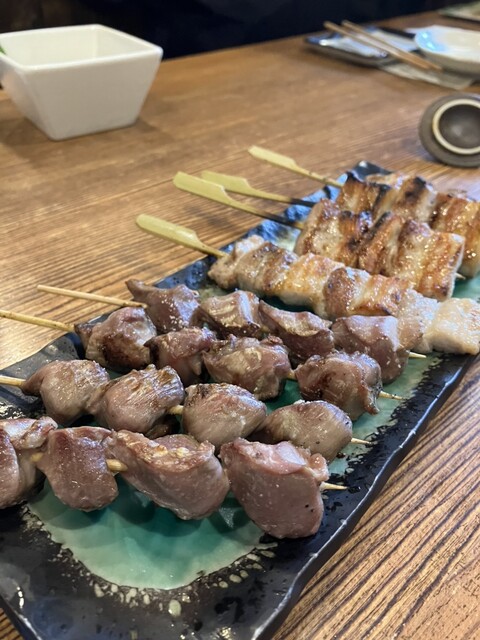 はやきとり、きも、つなぎ 、生田楽ごま、あわ、よもぎと、手羽先、砂ずり、豚バラ、濃厚塩だれレバー、だし巻、九条葱と鶏ホルモン焼 と蔵出し原酒をたらふく頂きました。