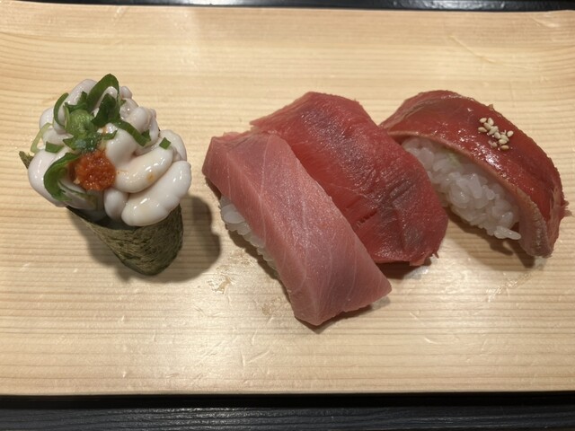 生タコ、塩レモンが塗られてた。とても美味しい。先日別の立ち食い寿司で初めて生タコ食べたが美味しいですね。そちらのお店も塩レモンだったような。
