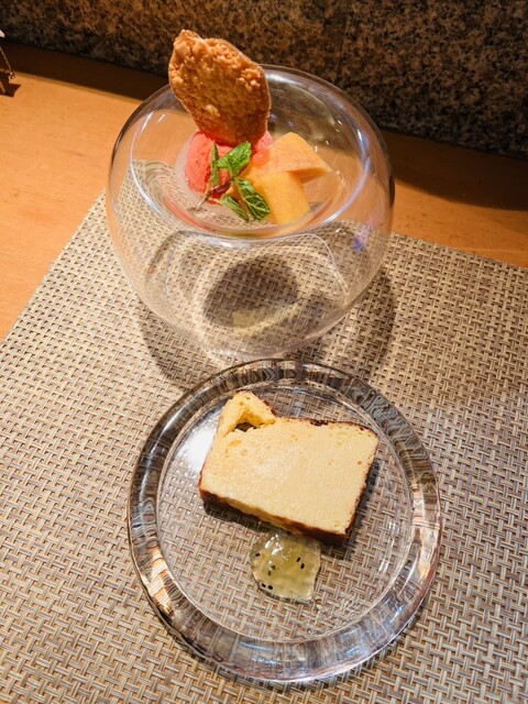 可愛いー!選んだバスクチーズケーキだけでなく、上にはイチゴのソルベやチュイール、柿もあり楽しめました。