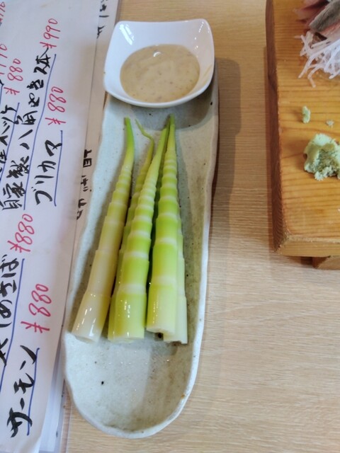 次いで竹の子、ウド酢味噌和え、ツブフライ(初食感!)、串カツ、最後は八角刺身!