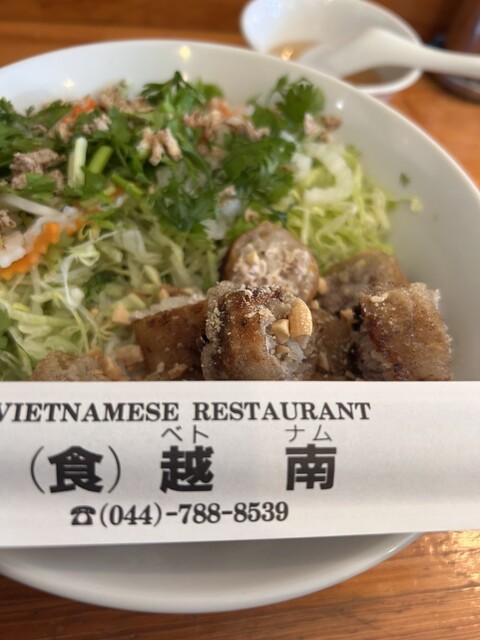 ビーフンのような細麺に野菜と揚げ春巻きが乗った汁なしのものをいただきました!