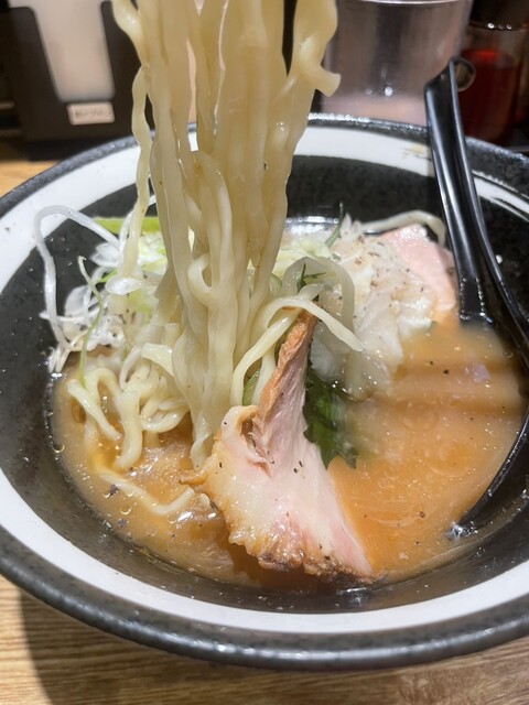 本日は女性の日なのか、店内半分以上女性で埋まる。のりあきさんは居ませんでしたが、兼ねてよりお願いしていた、つけ麺用の太麺にて、ラーメンをお願いする( *´꒳`* )