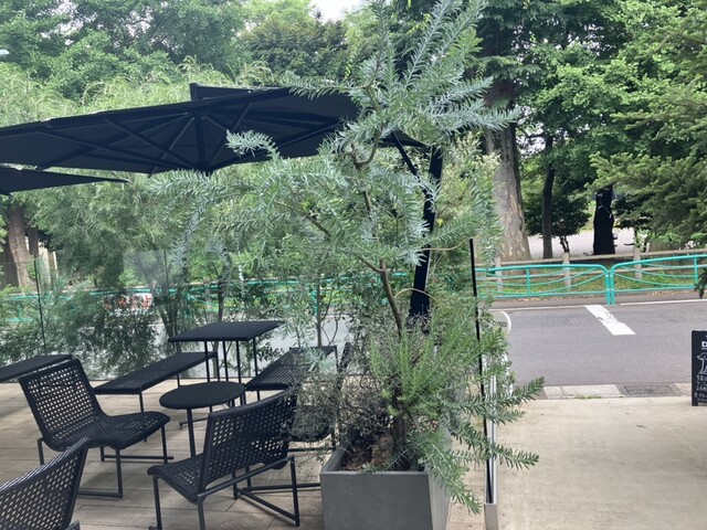テラス席はワンちゃんも一緒でOKだそう!公園に散歩に来た時には寄りたくなりますね。駐車場もあるので助かります。通ってしまいそうです!