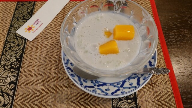 濃いココナッツミルクに、細かいタピオカ、マンゴーが入っている。ココナッツミルクに何か加わってるのだろうか?かなり濃厚で粘性が高く味が濃い。タピオカによく味が絡む。マンゴーにも勝ちかける味の濃さ。かなりコッテリしてるので、締めにあっさりを求めるならアイス類の方が良いかもしれない。