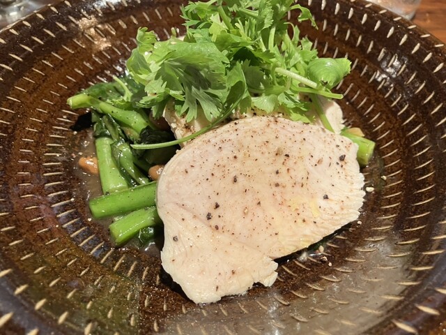 蒸し鶏と青菜の炒め物。こちらは美味しい。青菜の食感もよかったです。