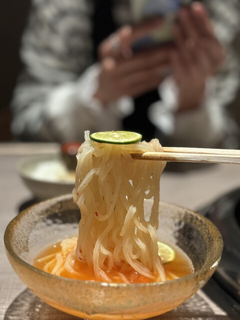 冷麺は明太子ベースのタレで美味。お腹いっぱいでも入る。