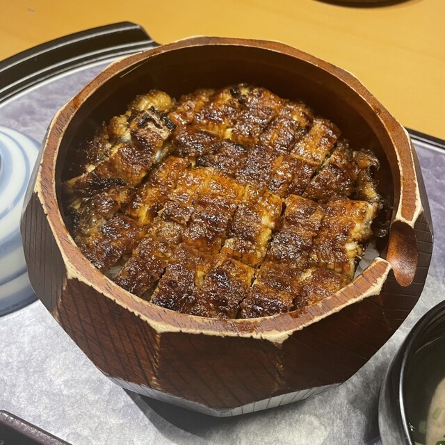 木桶に美しく盛り付けられた鰻は、香ばしい焼き目とふっくらとした身の食感が印象的で、