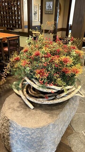 知覧観光の途中で立ち寄り。武家屋敷の街並みに溶け込むような木造建築で、外観からすでに雰囲気満点。店内に入ると天井高めの和空間と立派な生け花が出迎えてくれて、まさに旅先グルメのワクワク感が一気に高まります。