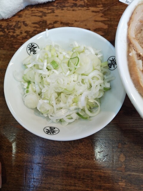 しばらくするとらーめんが到着しました。背脂がたっぷりと浮かんだスープにチャーシュー、薬味ネギ、トッピングのメンマがのっています。追加の薬味ネギは別皿で提供され、かなりの量です。