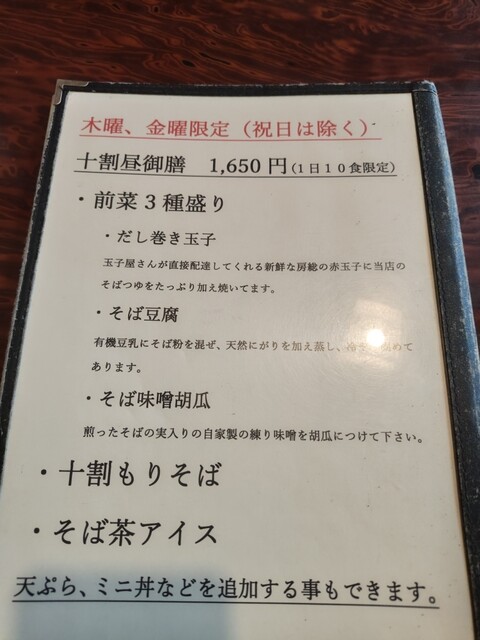10食限定ですが、無事に注文できました。前菜3品からいただきます。そば豆腐はなめらかな口当たりに程よい苦味があり、大人な味です。だし巻き玉子は、フワッとしていて、そばつゆを加えているそうでおいしいです。そば味噌胡瓜は、そばの実入り自家製の味噌の風味がよく、こちらもおいしくいただけます。