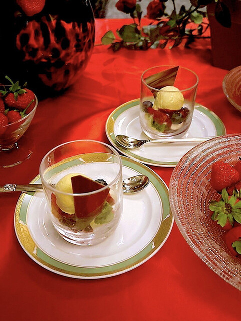 ★スタンドには、一品一品にフレッシュないちごを取り入れた 華やかな前菜と魚料理が並び、 メイン料理にはローストビーフが!