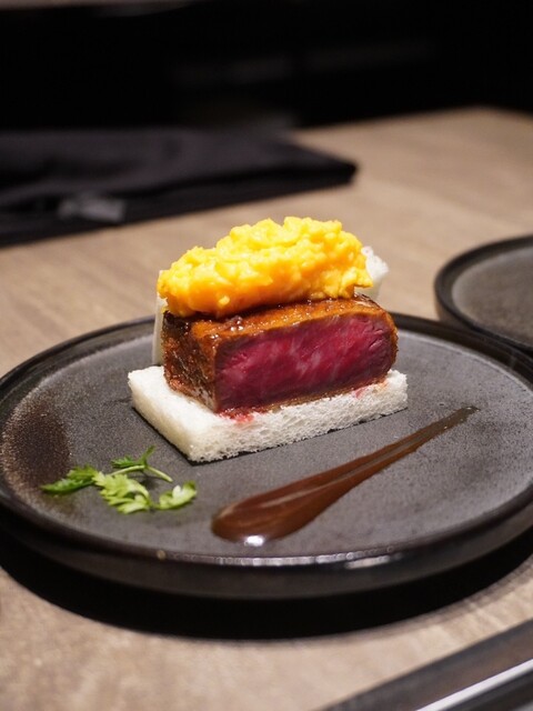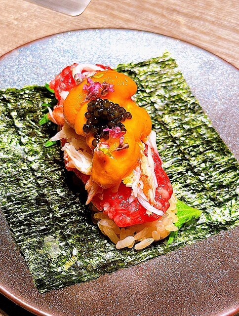 とろける和牛に、濃厚なズワイガニと雲丹、さらにキャビアの塩味が絶妙にマッチ。贅沢すぎる一品。
