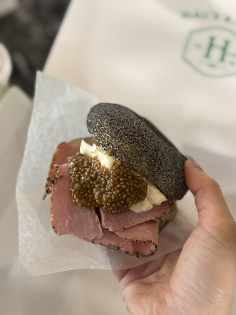 少し酸味のある大粒マスタードが食欲にそそられまくり。(ずるいぞー!)上面に大量に敷き詰められた黒胡麻のプチプチ感と、クリチの甘さがチグハグ感ゼロで融合。完成度高すぎました。