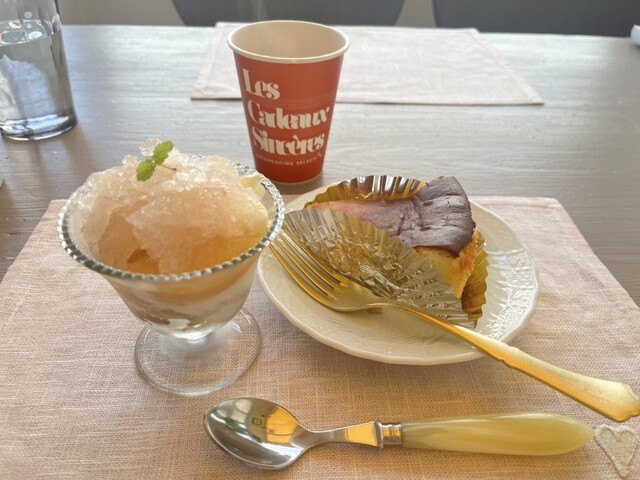 桃のかき氷が乗った桃のパフェ そしてこの前食べて美味しかったチーズケーキも追加で(*^ω^*)