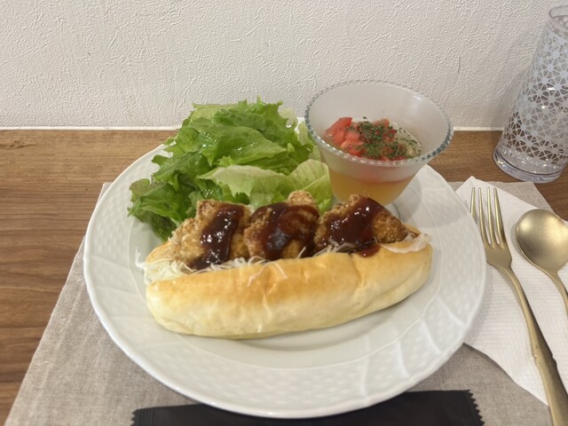 コッペパンサンド コンソメジュレのスープも暑い夏には食べやすくて最高です(๑˃̵ᴗ˂̵)