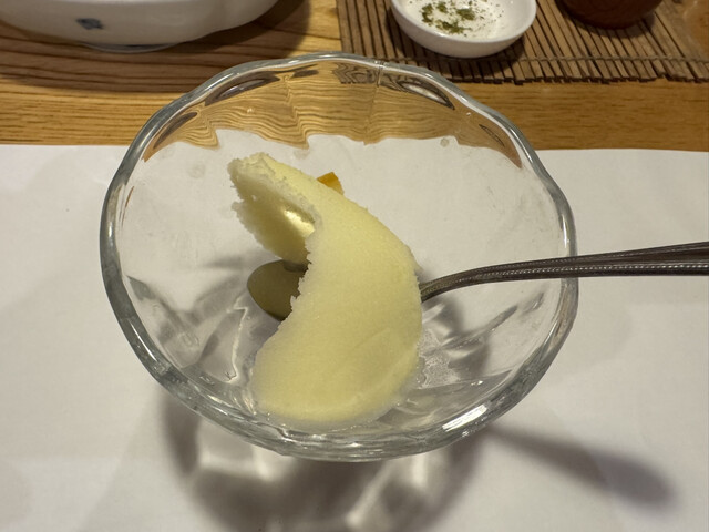 柚子のシャーベット。カットした柚子のシロップ漬が不思議な食感