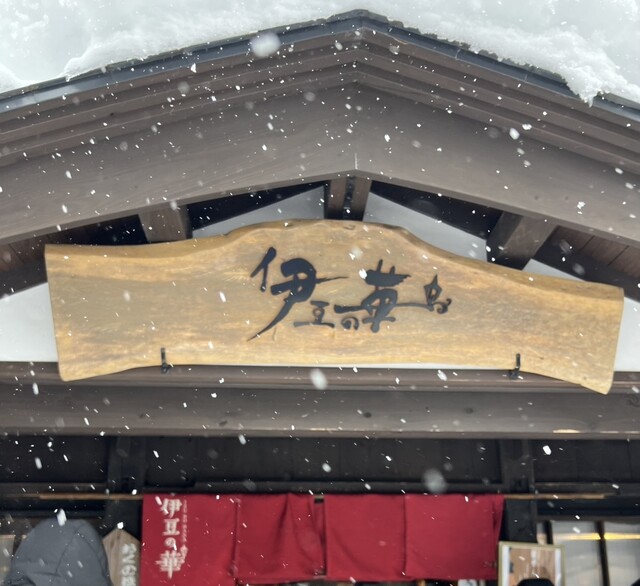 雪が吹雪いていて昼過ぎに到着した時は、観光客は思ったより少なめでした。内心、人が多くないことを喜びつつ、伊豆の華へ。しかしすでに7組待ちとのことで受付を済ませて待つことに。店内の待機スペースには案内されてからしか入れないので外で待ってくれとのこと。それから約25分間待機。外はかなり冷え込んでいて、しかも風も強めで吹雪いていたので、正直なところ待ち時間はなかなか大変でした。冬場は防寒対策必須です。もっと観光客が多い日は尚更待ち時間は長くなるかもしれません。