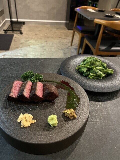 香りの強い春菊を主役にしながら、クセを感じさせない仕上がりで、お酒が進みそうな一品。スタッフさんからステーキの後の箸休めにも良いとお聞きしたので、半分くらいはステーキ後のために取っておきました。