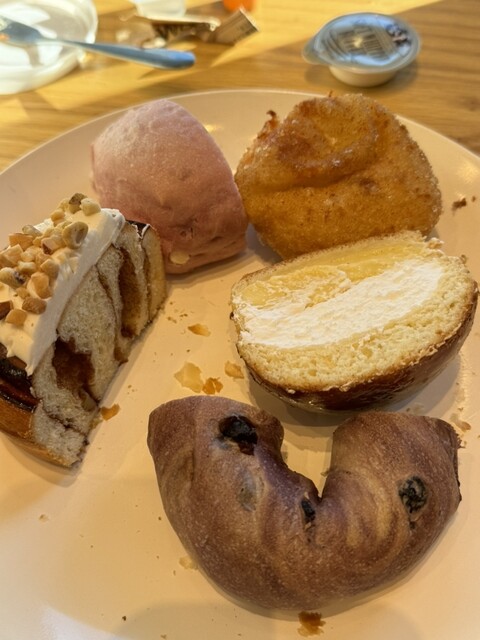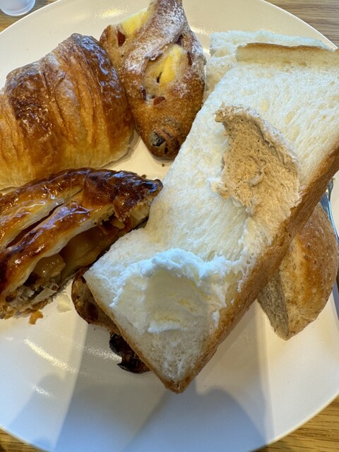 軽井沢が本店の浅野屋ですが、多くの支店を出していますが、こちらよお店だけ2ドリンク1,320円で60分間食べ放題。パンも20種類以上ありました。パンはハーフカットされており温かいものが用意されてますが、冷めたものはトースターで再加熱も可能です。バター、ジャムもあり美味しいパンをたくさん頂きました。8時に入店しましたが、並ばずに入れました。8時半には店内は満席になっていました。