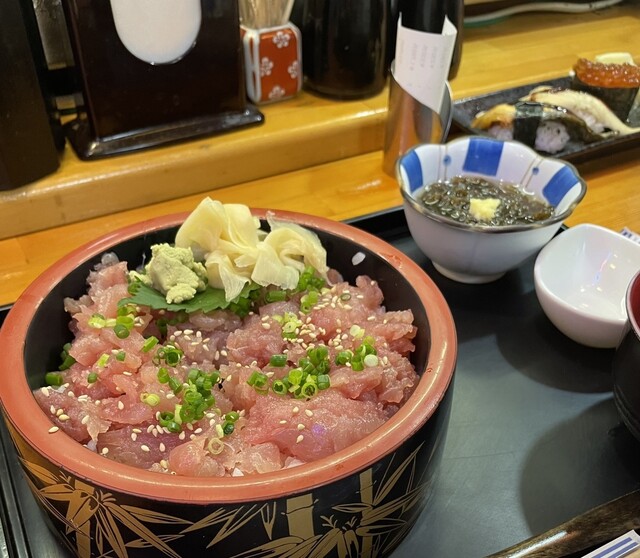 寿司20貫のセットが特に人気のようですが、かなりボリュームがあるため、マグロの中落ち丼(880円と)いくらの軍艦をいただきました。