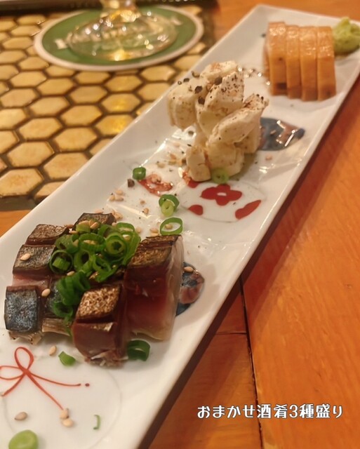 ・おまかせ酒肴3種盛り: ちょっとずつ楽しめてめちゃくちゃ満足度高かった!特に長芋のたまり醤油漬けと薫製数の子クリームチーズが好きꔛෆ