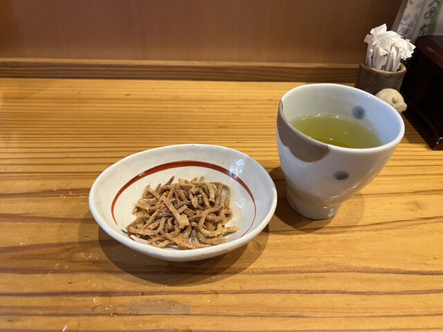 蕎麦はとても美味しい、自分で好きな量で生わさびをすり下ろすことができる。かき揚げはパリッとしていて海苔の風味が香ばしくて良い。