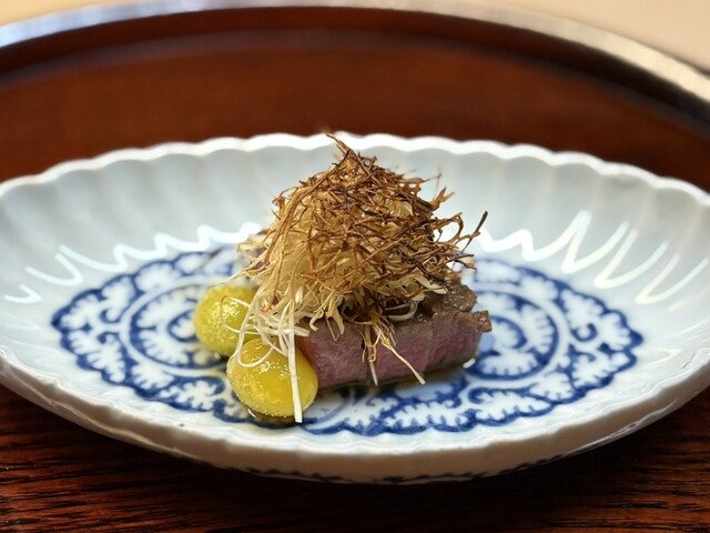 いうくらいまで裂かれた松茸が乗せられた和牛は