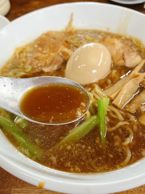 大きなチャーシュー2枚、シャキシャキな小松菜、濃厚なスープ、煮卵1個、麺、どれも旨し。