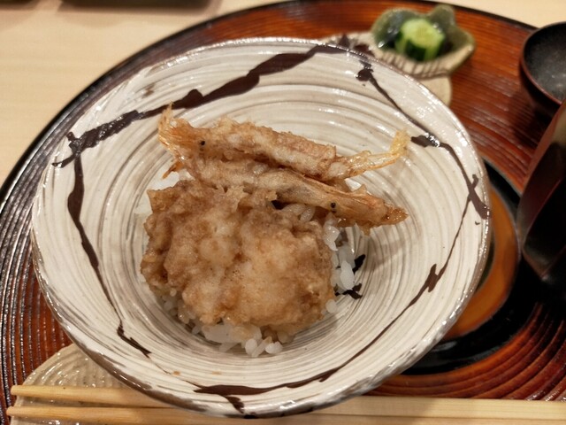 白えびの小天丼と涸沼産蜆の赤出しと摘果メロンと柴漬けのお食事