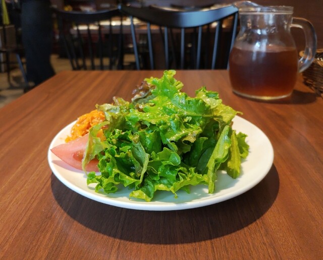 サラダ:葉物中心のサラダにトマトと人参のラぺが添えられている。ドレッシングは自家製だろうか、程好い塩味と甘味が美味しい。人参のラぺは酸味が利いて味付けも丁度良いが、細く切られているものの確かな歯応えがあり、とても美味しかった。