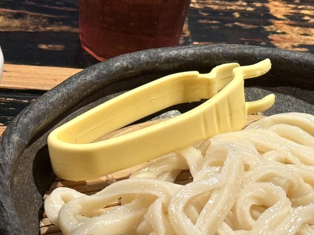 うどんはかなり長く、コシがめちゃくちゃありますのでうどんカッターを使いつつ食べ進めます。