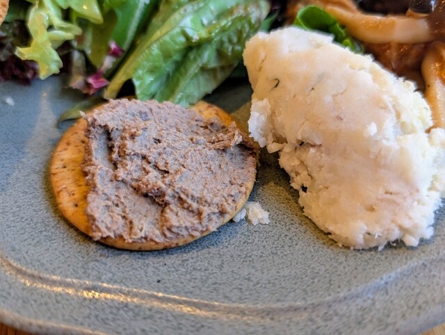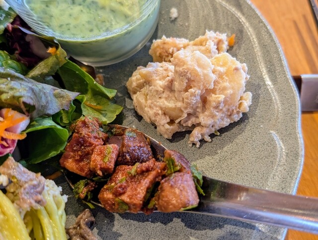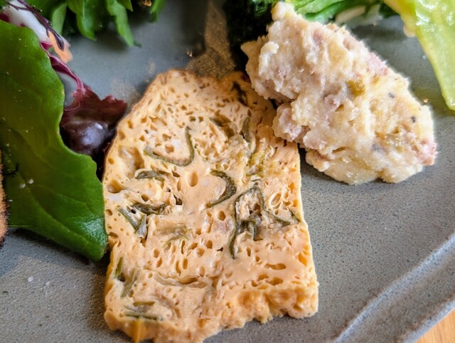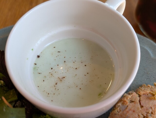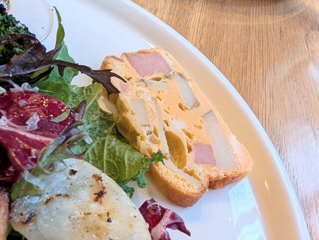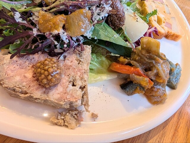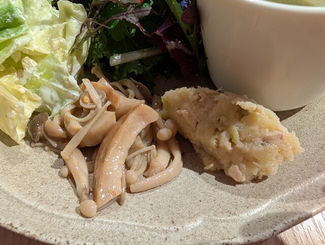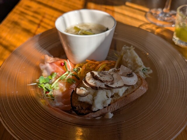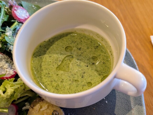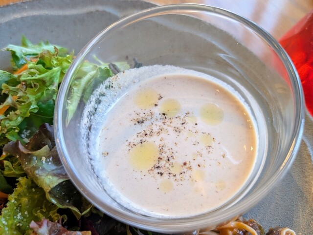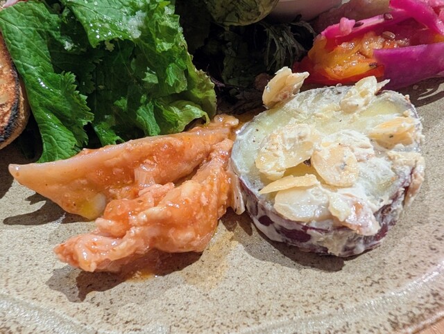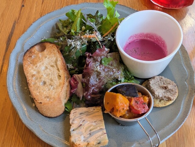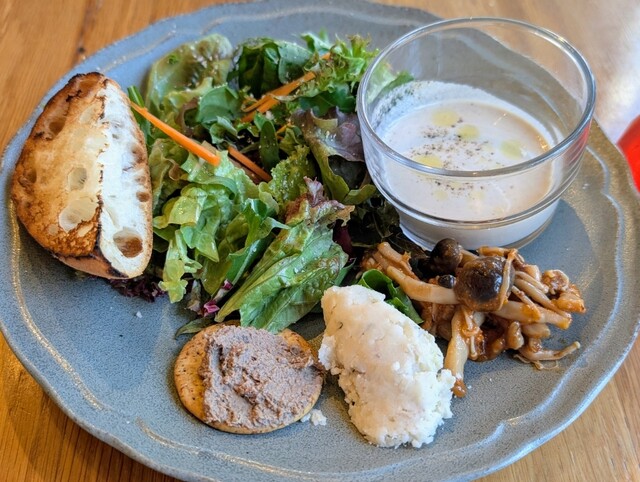 毎回内容が変わるサラダプレートはスープが春菊のポタージュ、前菜はジャガイモや砂肝を使った今までにいただいた事のない品々、新鮮なサラダと…いつも通り盛りだくさん( ꈍᴗꈍ)✨