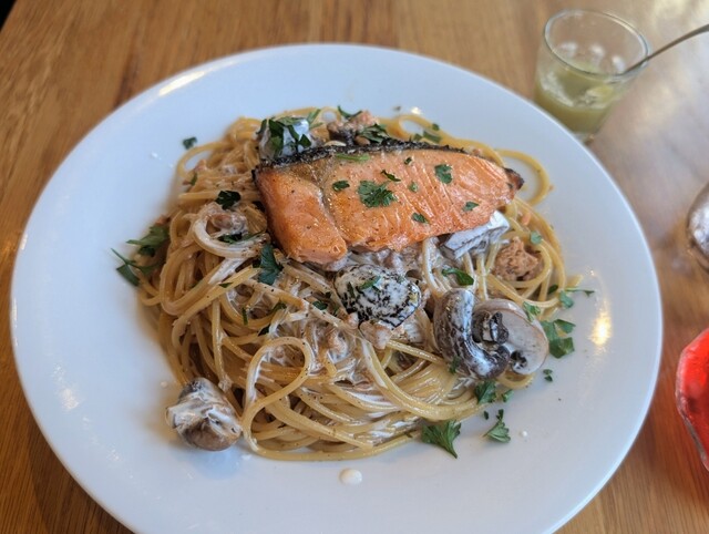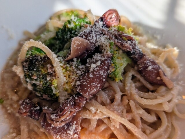 パスタは大きな牡蠣が二つずつとカブやブロッコリー、しいたけも入ってめちゃくちゃ美味しい♡(*´▽`*)