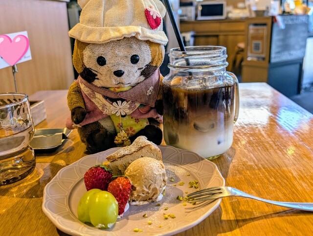 デザートはラスちゃんの大好きなキャラメルのチーズケーキとベリーのアイスにイチゴのトッピング♡もちろん♪ラスちゃんも大満足(´(ェ)`)オイシ~♡