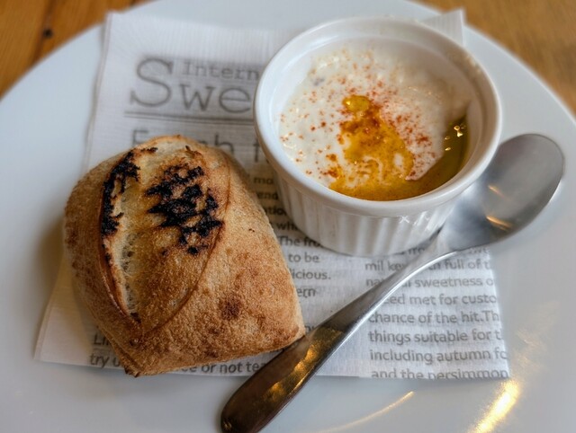 リゾットは上にはさつまいもチップス(おさつどきっみたいの)が乗って食感も楽しい♪︎