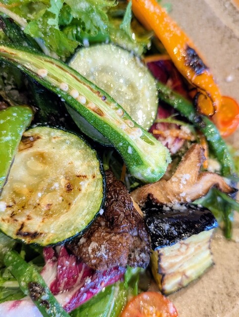 こちらは新鮮な葉野菜の上に釜焼きのお野菜やきのこが乗ったチバットリアさんの代名詞とも言える逸品です♡